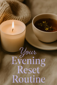 Lit candle, cozy blanket, and tea in soft setting with “your evening reset routine” in lavender script. content creation, image prompts, viral content, pin design tips, social media visuals