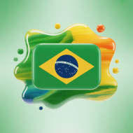Brazil-inspired mini flag with gentle curves fluttering over abstract green-yellow watercolor splash, softly lit, perfect for sleek storefront designs