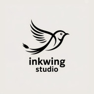 Flying bird with brushstroke feathers in soft black lines, inkwing studio written below in clean type, simple and expressive mark for artistic branding use
