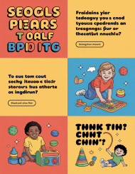 Educational toy post with bright red, blue, yellow colors, kids playing and fun drawings, bold type and call to action boost engagement and learning