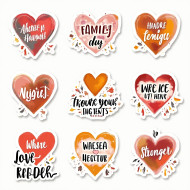 Geometric hearts and homes with bold colors and strong quotes like stronger together, pop art style celebrates family unity in fun and modern stickers