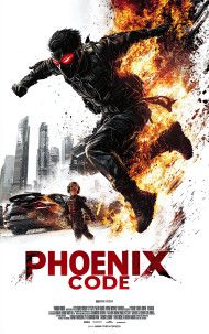 Action movie poster of masked vigilante leaping from fire blast, city skyline behind, reflection shows child with mask, concept of justice and past