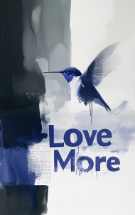 Love more painted with a hummingbird in the background, abstract paper collage and thick paint details, theme of kindness and peaceful emotion