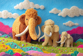 mammoth family walking grassy meadow smiling joyful confetti woolly prehistoric felt soft cutout handmade texture layered colorful bright playful child friendly sky clouds blue herd trunk nature cute fun animal whimsical happy outdoor illustration adventure sweetImagine Buddy