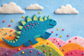 stegosaurus sliding hill playful joyful smiling felt soft textured handmade cutout colorful bright child friendly outdoor sky clouds blue confetti fun dinosaur prehistoric cute whimsical movement nature toy fantasy illustration happiness cheerful action innocenceImagine Buddy