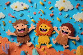 cavemen group cheerful dancing joyful smiling confetti felt cutout soft handmade texture layered colorful playful child friendly blue sky clouds prehistoric fun happy silly primitive motion celebration whimsical outdoor fantasy character art nature bright tribeImagine Buddy