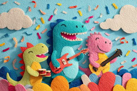 band dinosaur music baby instruments joyful smiling playful confetti felt soft handmade textured layered colorful bright cutout child friendly happy cute sky blue clouds toy sound whimsical prehistoric creative outdoor fantasy animal fun rhythm performance artImagine Buddy