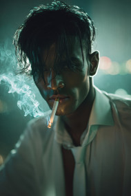 noir portrait man sideview cigarette lowangle harsh contrast misty city escape fire midnight blur shirt undone tie lighting sharp urban moody split dewy scars lonely cinematic chatgpt prompt noirportrait cool dark isolation stare texture smoke greytone shadowsImagine Buddy