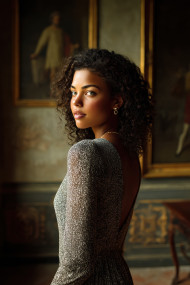 fineart portrait woman graceful artistic painterly antique room texture dress serene soft lighting composition muted color dramatic shadows atmospheric standing turned away expression elegance wide framing moody classic vintage cinematic chatgpt prompt feminine interior timeless depthImagine Buddy
