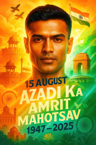 Indian man stands proud with jets, waving flag, iconic monuments, and tricolor mist behind, text blends years and pride. patriotic ai prompt, indian independence day image, chatgpt art prompt