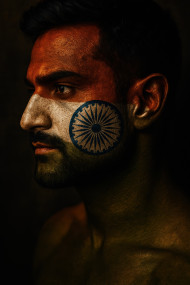 Indian man with beard and flag-colored face paint, deep blue chakra on cheek, soft light profile shows calm pride. flag on faces prompt, ai independence art, patriotic face paint, chatgpt image prompt