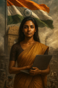 entrepreneur woman saree laptop india gate patriot tricolor flag handmade industry rural selfreliance leader traditional serene expression powerful cloth stone texture heritage lighting grayscale cloudy background sacrifice unity independence freedom local economy strong poster chatgpt promptImagine Buddy
