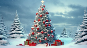 Snow-covered christmas tree and presents, christmas stock image ai, christmas stock photos ai