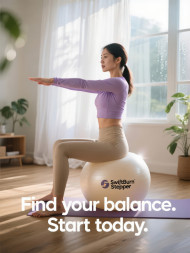 Woman in lavender top stretches on balance ball in calm home gym with plants and morning sunlight, relaxing wellness concept, fitness products chat gpt prompts