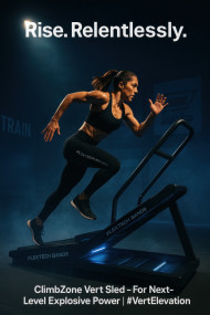 Elite woman athlete pushing a stair sled indoors, sprinting upward with power and focus under dramatic lighting, fitness products chat gpt prompts for training