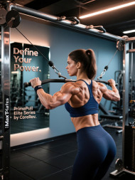 woman athletic navy sportswear cable crossover machine modern gym strong back muscles focus fitness products prompts strength exercise training toned female active performance lifestyle endurance health workout conditioning powerful discipline energy motivation sporty body posture resilience gymnasiumImagine Buddy