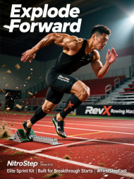 Explosive male sprinter launches from starting blocks on indoor track, sweat and speed captured in motion, fitness products chat gpt prompts for sprint training