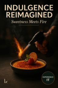 Luxury chef torching crème brûlée, golden flame burst frozen in action, smoke rising, sweet indulgence, chatgpt image prompt luxury chef in action poster