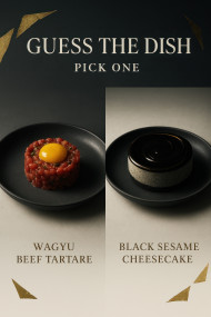Wagyu beef tartare with quail egg yolk beside black sesame cheesecake with glossy ganache in gourmet duel guess the dish prompt for chatgpt image