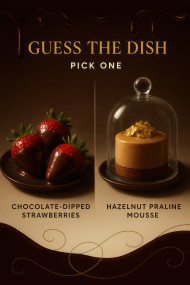 Chocolate dipped strawberries with shimmer beside hazelnut praline mousse dome with gold leaf in indulgent duel guess the dish prompt for chatgpt image