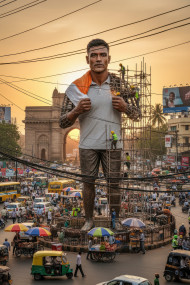 giant statue ai prompt google gemini nano banana indian man flag shoulders construction workers scaffolding mumbai sunset street busy city outdoors evening urban traffic crowd landmark monument architecture sculpture realistic tourism tall cityscape detailed nobodyImagine Buddy