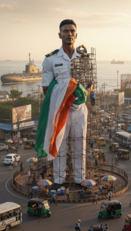 Giant statue ai prompt for google gemini nano banana of navy officer holding folded flag, statue under construction, workers on scaffolding, coastal visakhapatnam streets