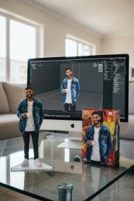 Realistic indian man figurine on triangular acrylic base in modern living room, glass coffee table, computer shows 3d rendering, toy packaging box, poster illustrations, google gemini nano banana figurine prompt