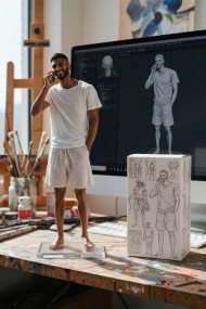 hyper detailed indian man figurine rectangular crystal base artist studio paint splattered shelf computer digital sculpting collector box ink line art illustration nano banana prompt miniature model sculpture craftsmanship creative hobby colorful realistic polished 3d collectibleImagine Buddy