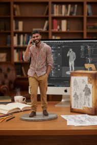 Realistic indian man figurine on oval granite base in a cozy library, wooden desk, computer shows cad design, toy packaging box, sketch illustrations, google gemini nano banana figurine prompt