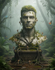 Pvc statue in amazon jungle, moss covered marble, explorers climbing ropes, maps and binoculars, ancient carvings, parrots, misty foliage, google gemini nano banana prompt for epic statue art