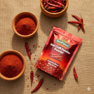 Red chili powder pouch on jute fabric with bowls of chili powder and dried chilies in warm sunlight