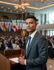 Global leader addressing summit with world flags in background showing diplomacy and confidence