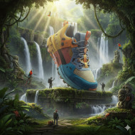 running shoe jungle ruins tropical landscape surreal realism colossal scale waterfalls cinematic lighting explorers morning mist adventure mood vivid greens advertising art lush foliage volumetric light fantasy realism tropical jungle advertising creativity surreal scenery dramatic textures travel concept exotic atmosphere detailed render cinematic adventureImagine Buddy