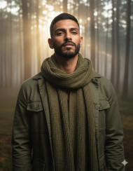 man portrait pine forest green jacket sunrise light natural lighting serene expression outdoor fashion cinematic atmosphere amber tones editorial style nature mood resilience concept harmony theme fashion editorial misty background calm strength outdoor portrait textured clothing male model golden light fashion photography natural elegance cinematic tone wilderness moodImagine Buddy