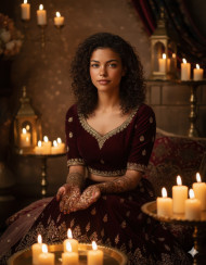 bride mehndi candlelight romance warmth love intimacy glow serenity beauty low light cinematic tone soft focus emotional portrait golden tones elegant wedding artistic lighting cozy atmosphere peaceful bride classic romance cultural celebration traditional decor mood lighting intimate setting gentle emotionImagine Buddy