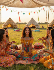bride mehndi floral friends celebration fairy lights joy boho chic happiness freedom meadow golden hour candid moment colorful tone relaxed atmosphere outdoor wedding natural laughter cinematic warmth festive spirit carefree bride emotional connection dreamy tone wedding decor lively event bohemian weddingImagine Buddy
