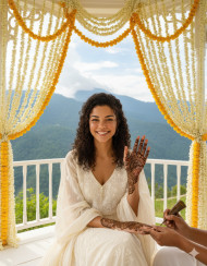 bride mehndi mountains nature joy serenity henna outdoor tradition happiness flower curtains cinematic tone natural light hillside wedding peaceful atmosphere fresh air candid moment cultural elegance bridal pose scenic view wedding ritual natural vibe bright tone relaxed bride joyful emotionImagine Buddy