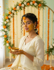 bride haldi turmeric wedding mehndi tradition minimal elegance serenity culture soft tones editorial portrait artistic bridal cinematic lighting indian wedding floral decor pastel wall cultural warmth confident woman gentle smile festive mood cinematic tones color splash photorealistic detailImagine Buddy