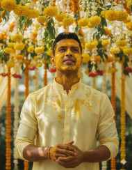groom haldi pastel kurta dreamy artistic cinematic floral canopy serene introspective emotion yellow blooms sunlight filter elegant tones editorial portrait warm hues authentic detail photorealistic image cultural emotion storytelling photographyImagine Buddy