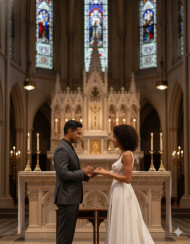 wedding couple exchanging rings altar cathedral candlelight ceremony emotional classic style timeless romance elegant composition editorial lighting sacred vows cinematic tones warm ambiance love story cultural tradition intimate moment photorealistic detail fine art wedding soft focusImagine Buddy