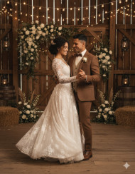 wedding couple dance rustic barn newlyweds romance vintage joy string lights love celebration country style floral decor cinematic tones warm light editorial quality cozy ambiance authentic emotion classic wedding photorealistic tones storytelling moment happinessImagine Buddy