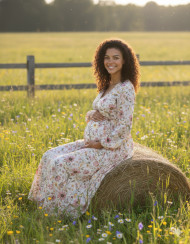maternity photoshoot pregnant woman floral dress hay bale countryside rustic charm wildflowers warm light joyful peaceful wooden fence golden field outdoor portrait editorial quality cinematic tone soft bokeh motherhood connection photorealistic details natural lifestyle heartfelt momentImagine Buddy
