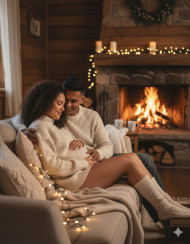 maternity couple pregnant woman cozy home fireplace knitwear warm light intimate affectionate rustic cabin joyful hygge aesthetic fairy lights lifestyle portrait cinematic tones editorial quality photorealistic emotional warmth relaxed mood tender atmosphere natural settingImagine Buddy