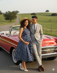 maternity couple pregnant woman classic car vintage style retro countryside polka dot dress nostalgic loving elegant 1950s fashion outdoor portrait cinematic composition editorial tone motherhood charm photorealistic image romantic vibe timeless style rural backdrop playful moodImagine Buddy