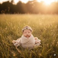 newborn baby beige muslin flower crown boho elegance natural light golden hour dreamy tones meadow soft sunlight peaceful editorial-quality cinematic tone photorealistic details organic textures tall grass outdoor portrait natural warmth baby photography ethereal moodImagine Buddy