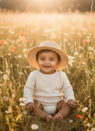 baby 1-year-old straw hat knitted romper meadow golden hour smiling baby natural light outdoor portrait joyful editorial photography cinematic composition photorealistic detail family lifestyle radiant child warm tones boho baby summer sunlight candid baby photo gentle moodImagine Buddy