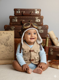 baby boy 8-month-old aviator cap goggles explorer theme vintage travel curiosity warm light adventure editorial baby photography cinematic tone old maps stacked suitcases photorealistic detail imaginative setup creative child portrait warm atmosphere storytelling composition charming toneImagine Buddy