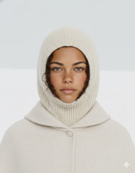Woman in cream knitted balaclava standing still in minimal snowy field