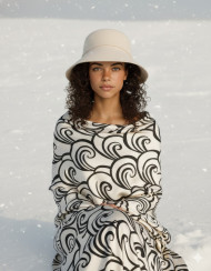 Elegant woman in cream cloche hat seated in snowy field at eye level