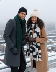 couple winter fashion playful expressions sleek coats rooftop scene full body 3/4 angle urban setting overcast light strong contrasts snow trend couple photoshoot prompts winter fashion trending prompts romantic winter editorial prompts oversized scarves soft fog lifestyle city aestheticImagine Buddy